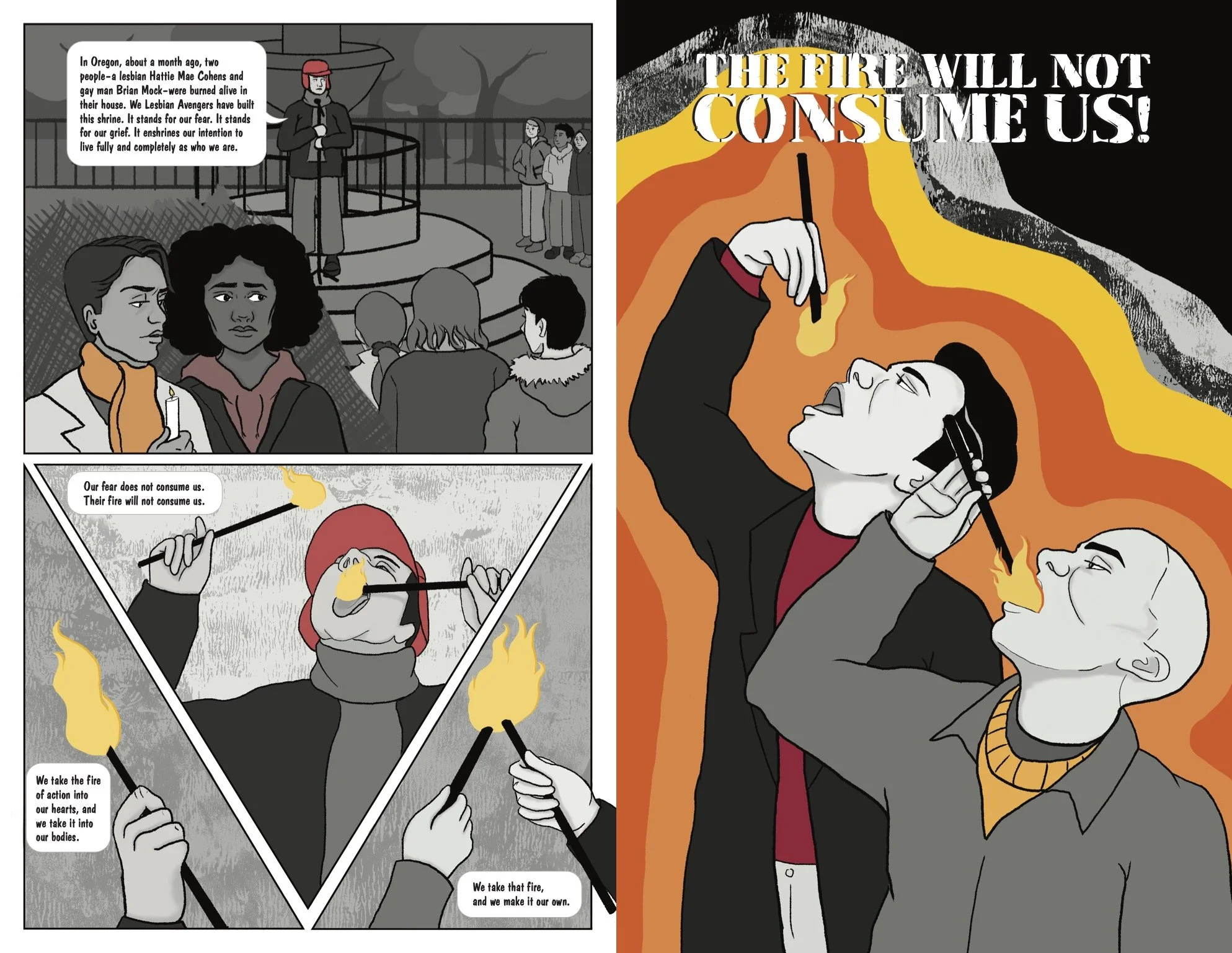 There are many unsung heroes in the history of activism. The graphic novel The Fire Will Not Consume Us highlights the Lesbian Avengers and the origins of their theatrical demonstrations of fire-eating as a form of protest. Each page contains gritty textures creating an independent zine-like quality. To further connect the graphic novel to fire-eating, every illustration is in grayscale except of pops of bold and blazing colors throughout each of the panels. The illustrations focus on the women rather than their environment to highlight the importance of communities of people coming together to create change in even the most challenging circumstances. The story is a reminder to look for the light in a world of hate. Do not be consumed by fear–take action!